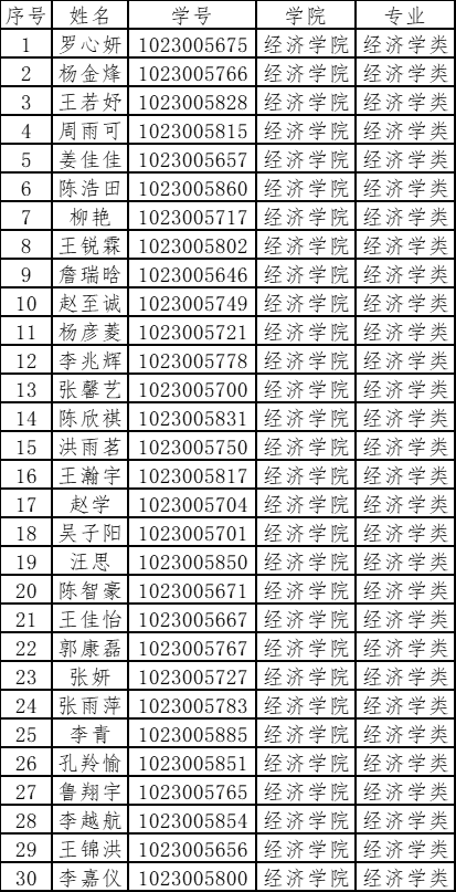 按照学校“关于2023级新生英语水平测试及各类试点班选拔等事宜的通知”的要求,经本人申请,按照公平、公正、公开的原则,银娱geg优越会线路组织专家组进行了面试考核,综合笔试面试形成总成绩排序,选拔30名学生进入2023级数字经济试点班学习。现将名单公示如下: