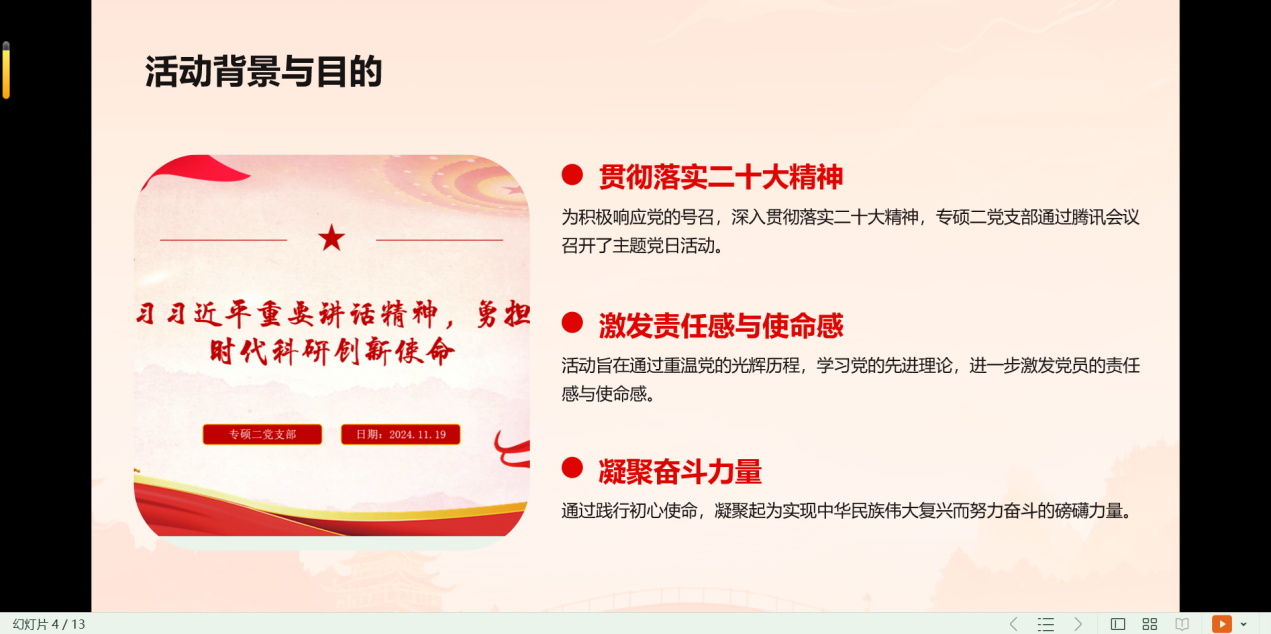 为积极响应党的号召,深入贯彻落实二十大精神,专硕二党支部于12月16日晚7点,通过腾讯会议召开了以“践行初心使命,凝聚奋斗力量”为主题的党日活动。此次活动旨在通过重温党的光辉历程,学习党的先进理论,进一步激发党员的责任感与使命感,凝聚起为实现中华民族伟大复兴而努力奋斗的磅礴力量。