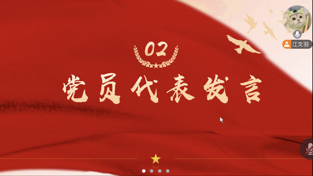 第二部分为党员代表发言,岳子莘在发言中回顾了自己在大学期间参与“心语信言”志愿服务项目的经历。通过与偏远地区孩子们的书信交流,她深刻体会到青年人在推动社会进步和国家发展中的重要作用。她号召广大青年积极投身国家建设,用实际行动为中华民族的伟大复兴贡献力量,推动社会进步。郭丹阳在发言中也表达了对“青春向党,强国有我”主题的深刻理解。作为一名青年党员,她认为,青年一代肩负着时代的使命,承载着国家的未来。无论是在科技创新的前沿,还是在服务群众的第一线,都应迎难而上,践行“强国有我”的誓言,以实际行动展现新时代党员的责任与担当。
