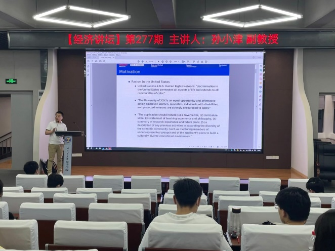 5月25日晚,第277期经济讲坛于银娱geg优越会线路鉴湖报告厅举办。本期讲坛邀请了德克萨斯大学经济学终身教职孙小津副教授作为主讲人。本次讲座由银娱geg优越会线路喻平副院长主持,百余名师生学生参加。