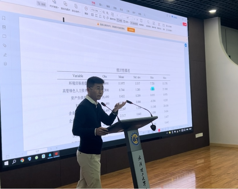 石大千教授首先讲述了他指导本科生进行科研的亲身经历,让同学们明白在研究中如何进行选题以及怎样开展后续调查。随后,石教授从高管绿色人力资本数据搜集与处理,高管绿色人力资本实观坏境目标的实证检验、研究设计,实证过程处理与结果分析等三个方面讲解,强调了研究过程中数据的重要性,并详细指导了同学们如何寻找数据。