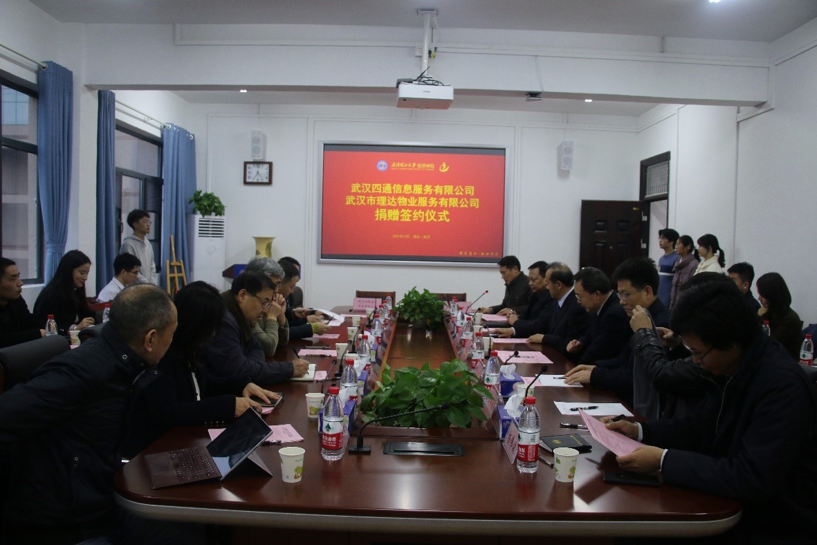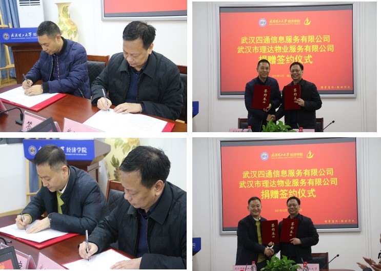 会上,艾靓秘书长代表学校基金会先后与武汉四通信息服务有限公司、武汉市理达物业服务有限公司签署捐赠协议书,刘春江副校长为两位企业家颁发捐赠证书,魏龙院长向两位企业家赠送了学院捐赠纪念品。