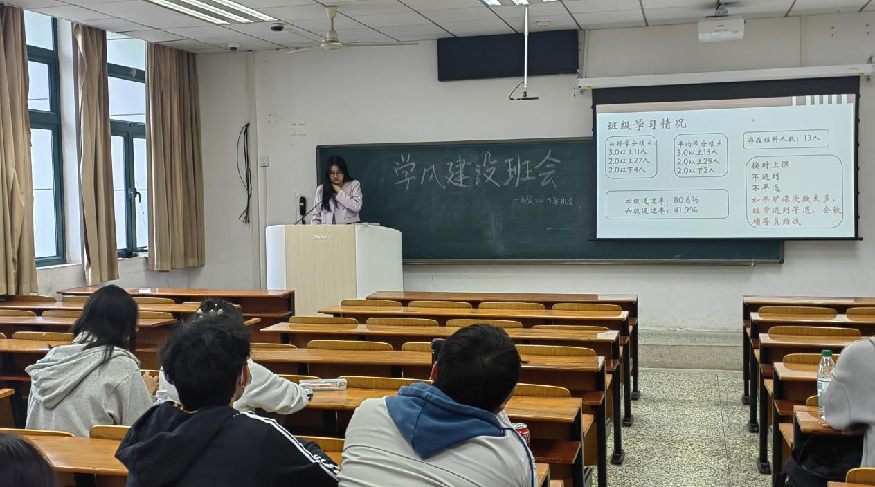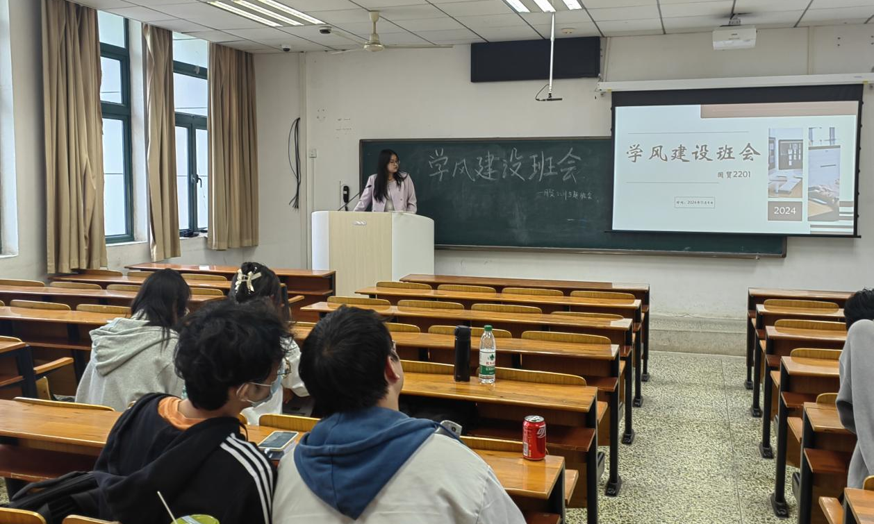 班会伊始,王帆同学首先介绍了学校关于学风建设的相关政策和要求,她讲到良好的学习习惯与学习氛围关系到同学们的成长和发展,大家要认真学习学校的规章制度,严格遵守各项纪律,积极参与各项教学活动。她还指出学风建设的重要性,良好的学风是大学精神的集中体现,是培养高素质人才的关键,只有营造浓厚的学习氛围,才能激发同学们的学习热情,提高学习效果。