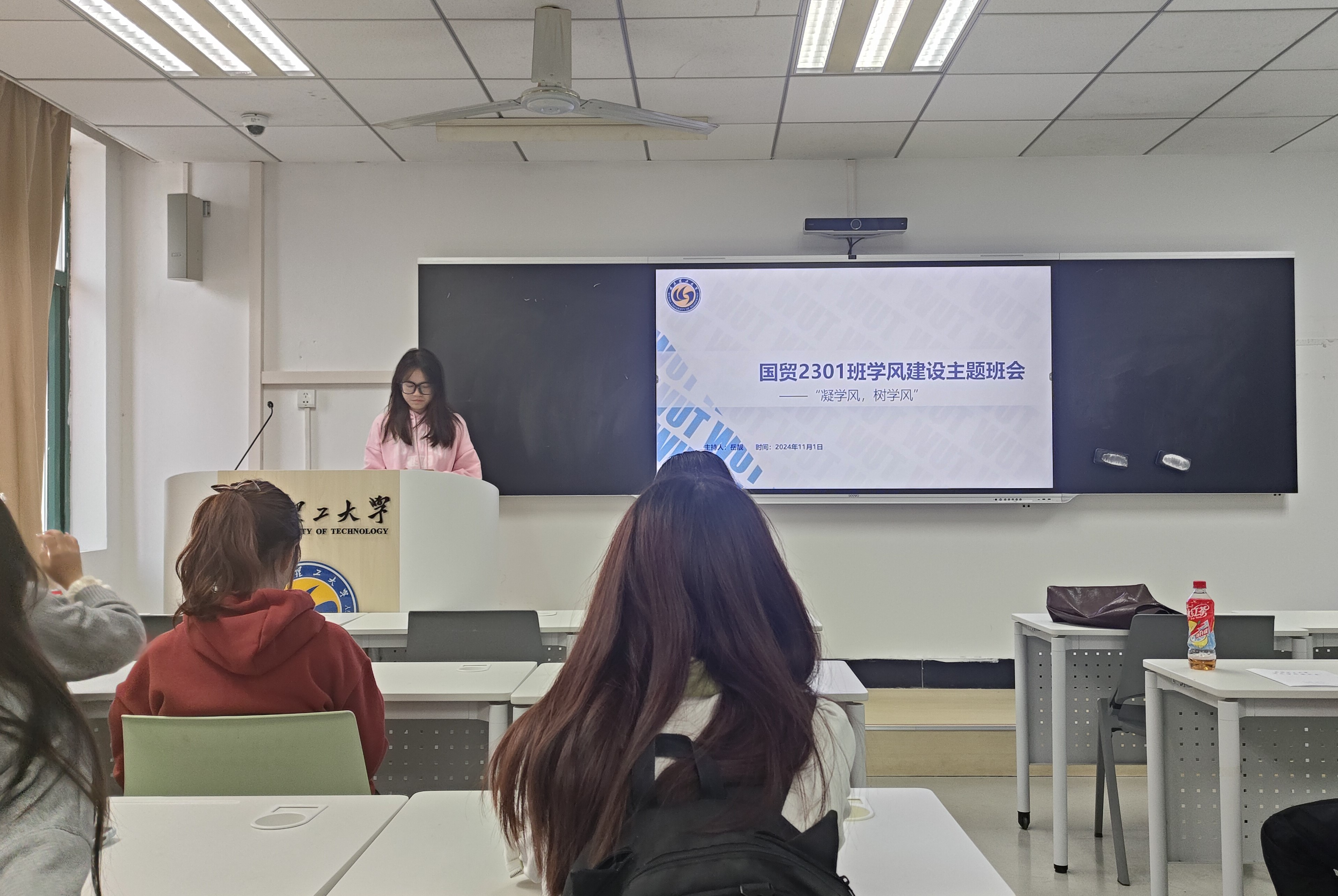 11月1日,国贸2301班全体同学在博学北楼611开展“凝学风,树新风”学风建设主题班会,旨在建设班级良好学风,加强班级凝聚力。此次班会由班长岳靓同学主持开展,班主任徐晓明受邀出席。