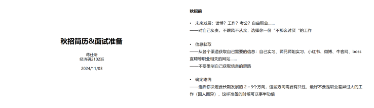 本次会议还邀请已毕业研究生代表进行经验分享。目前就职于百度公司的蒋仕昕同学向大家就秋招前准备、秋招简历、秋招面试三个方面进行详细讲解。就秋招前准备阶段而言,她全面阐述了如何选择自己的理想工作、如何获取秋招信息以及如何进行职业路线规划。其间,她重点强调对自己负责,不要盲目跟风,不要给自己的信息获取设限。就秋招简历撰写而言,她列举了简历需要囊括的信息板块并以个人简历作为示范,其中她着重强调要注重个人能力与岗位的匹配度,不要被专业限制,大胆尝试不同岗位。就秋招面试而言,她简明扼要地介绍了选岗方法、自我介绍技巧和面试问答的训练方式等,为同学们攻克面试难关助力。
