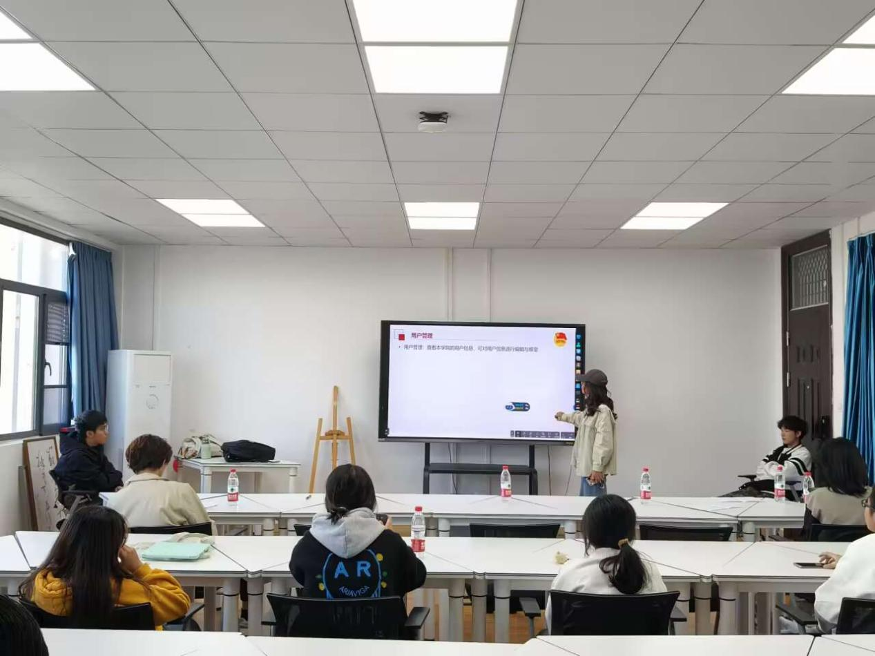 社会实践部副部禚鑫静向同学们介绍第二课堂的使用方法。她从活动开展、活动结束、活动签到等方面详细讲解了有关在第二课堂中发布活动的正确流程。并且又从留言评价、申报管理、记录审核等方面向同学们拓展了第二课堂的更多使用方法。