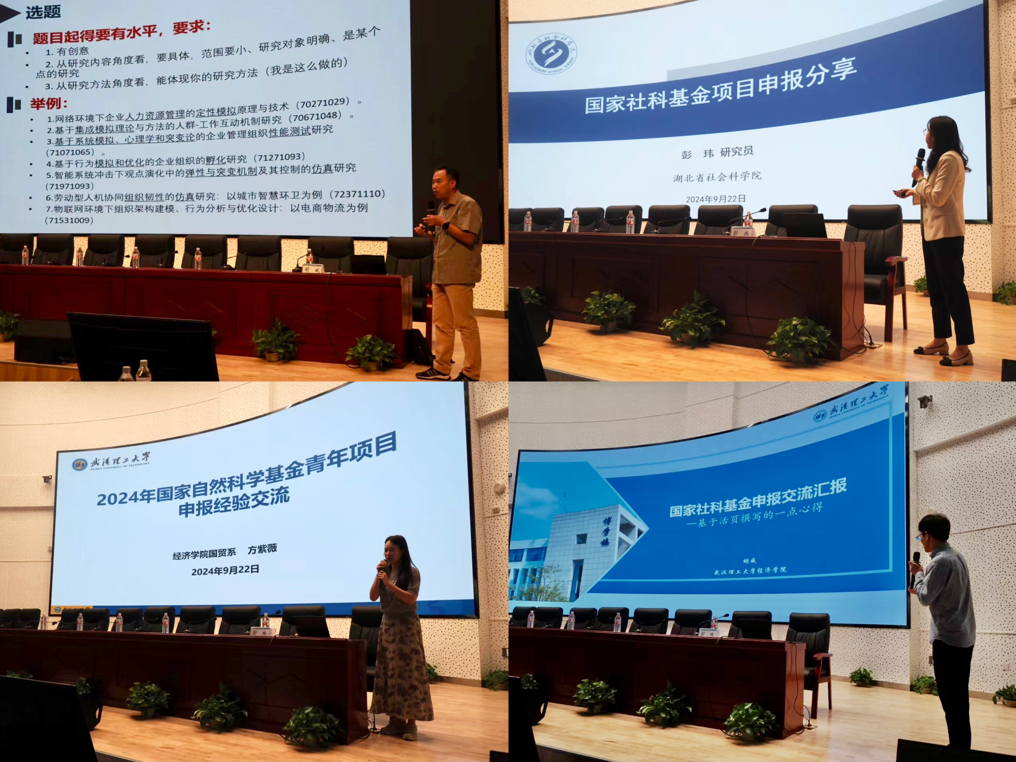 会上,学院邀请到华中科技大学教授、博士生导师胡斌以及湖北社科院科研处处长、研究员彭玮,分别就国家自科基金项目申报以及国家社科基金项目申报进行指导。学院青年教师方紫薇、胡威进行国家基金项目申报经验分享。