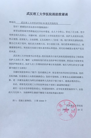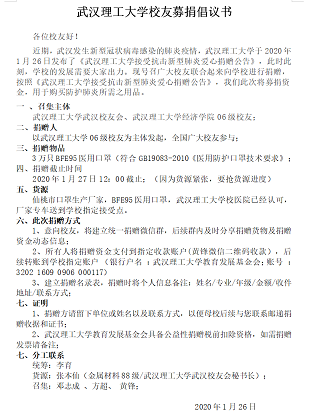春节期间,新型冠状病毒感染的肺炎疫情来势汹汹,牵动了全国人民的心。疫情就是集结号,危难时刻显担当,面对武汉理工大学医院抗疫物资尤其是口罩及防护服等医疗用品紧缺的情况,银娱geg优越会线路校友联合武汉校友会部分校友立即发起“防护疫情——武汉理工校友春风行动”募捐倡议计划,并获得迅速响应,短期内向母校捐赠了30000只BFE95的医用型口罩。