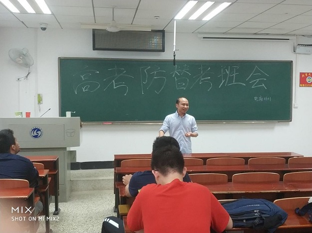 傅魁老师主持本次班会,他向同学们宣传省教育考试院印发的《关于2018年普通高考期间加强省属高校学生管理工作的通知》,此通知提出了高校加强学生管理,坚决杜绝在校学生违规参与高考替考等犯罪活动的要求。对此学校会制定高考期间学生管理和考勤政策,所有学生不得擅自离校,严禁参与替考;对于违反学校规定,擅自离校或进行替考的学生,需根据有关规定进行严肃处理。高考期间,各高校要组织学生管理工作进行全面排查,安排辅导员对在校学生逐一清点、核查,严格学生请假制度,没有特殊理由,6月7、8日两天高校在校生均不准请假离校。